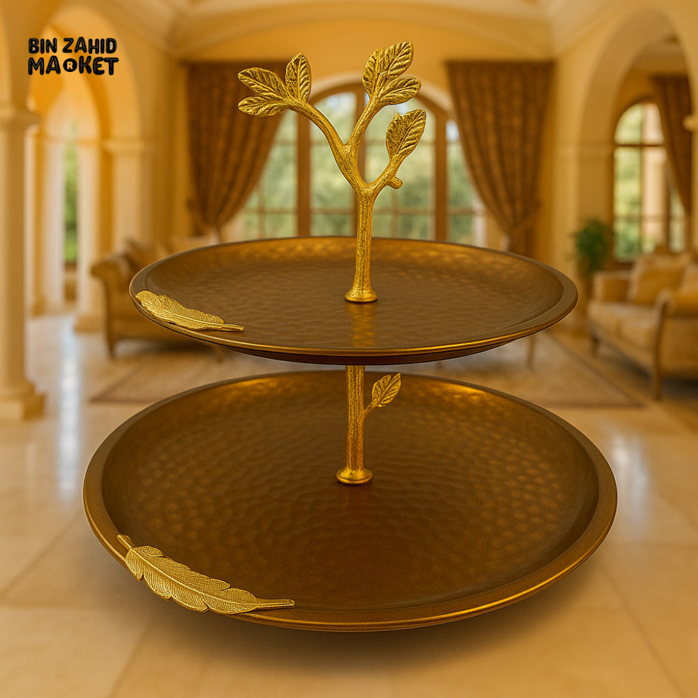 2-TIER LUXURY BRONZE SERVING TRAY WITH GOLD LEAF HANDLE – HIGHLY ELEGANT VILLA DECOR - ROUND