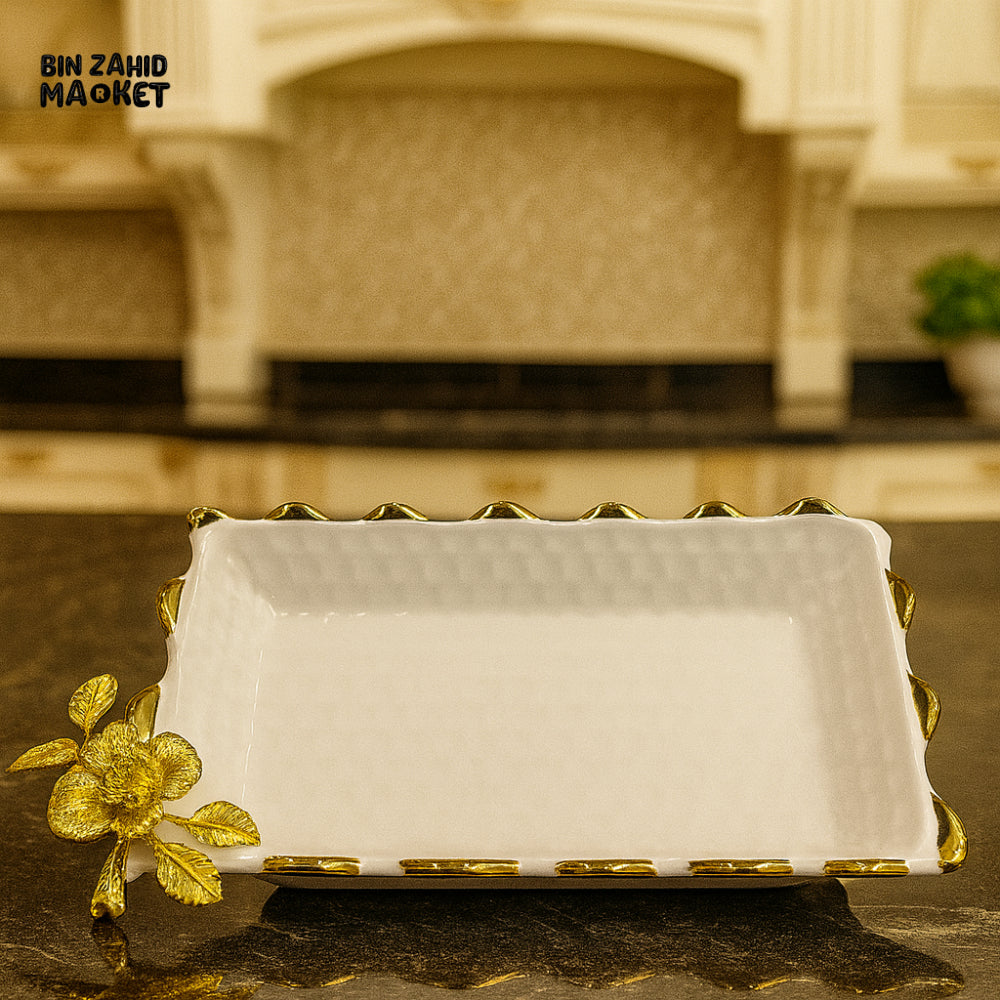 SERVING DISH WITH GOLD ROSE DETAIL – LUXURY KITCHEN TABLETOP PLATTER - 11 M11-W