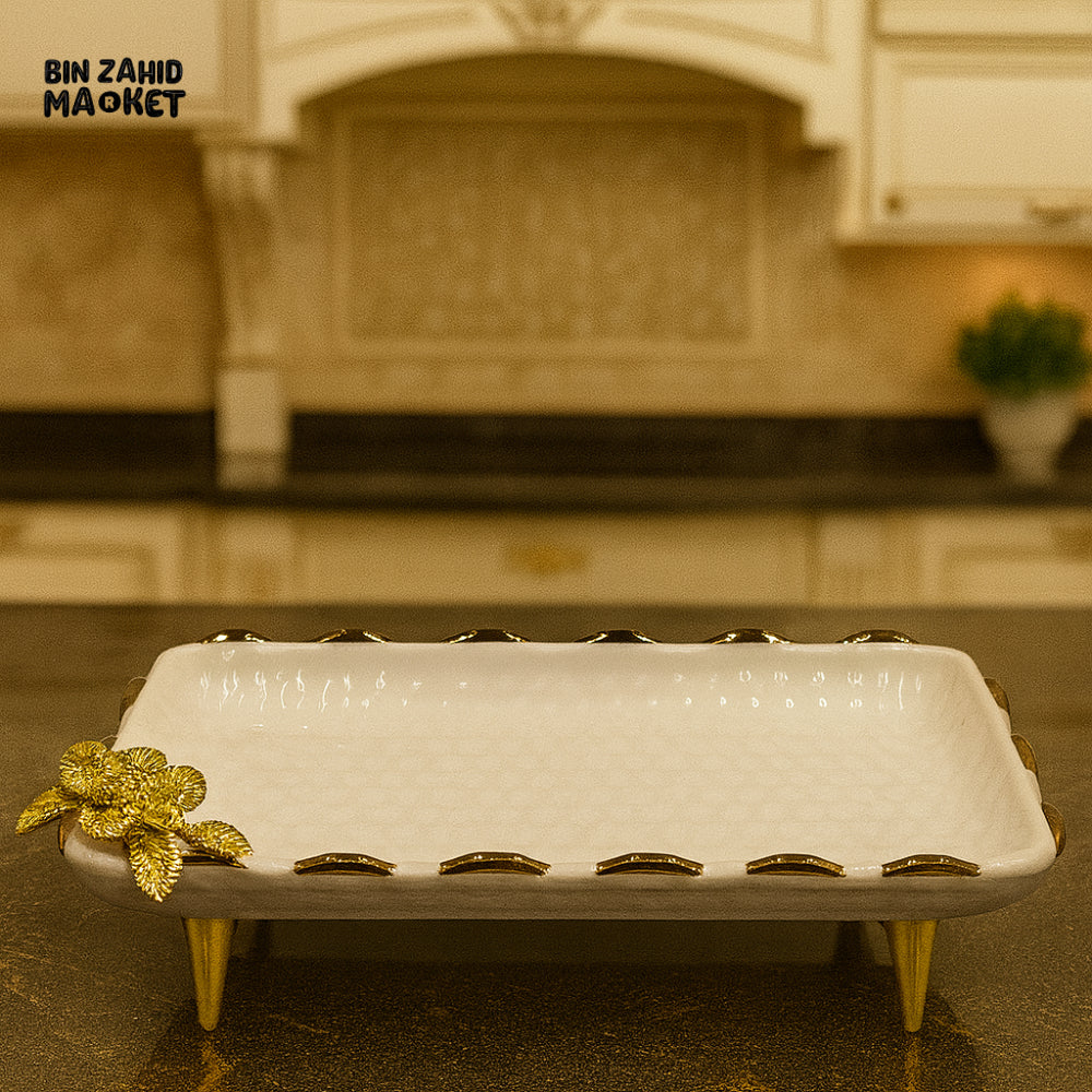 SERVING DISH WITH GOLD ROSE DETAIL – LUXURY KITCHEN TABLETOP PLATTER - WITH LEGS 12 M17-W