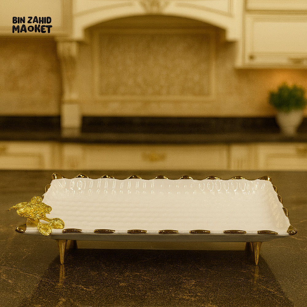 SERVING DISH WITH GOLD ROSE DETAIL – LUXURY KITCHEN TABLETOP PLATTER - WITH LEGS 15 M16-W