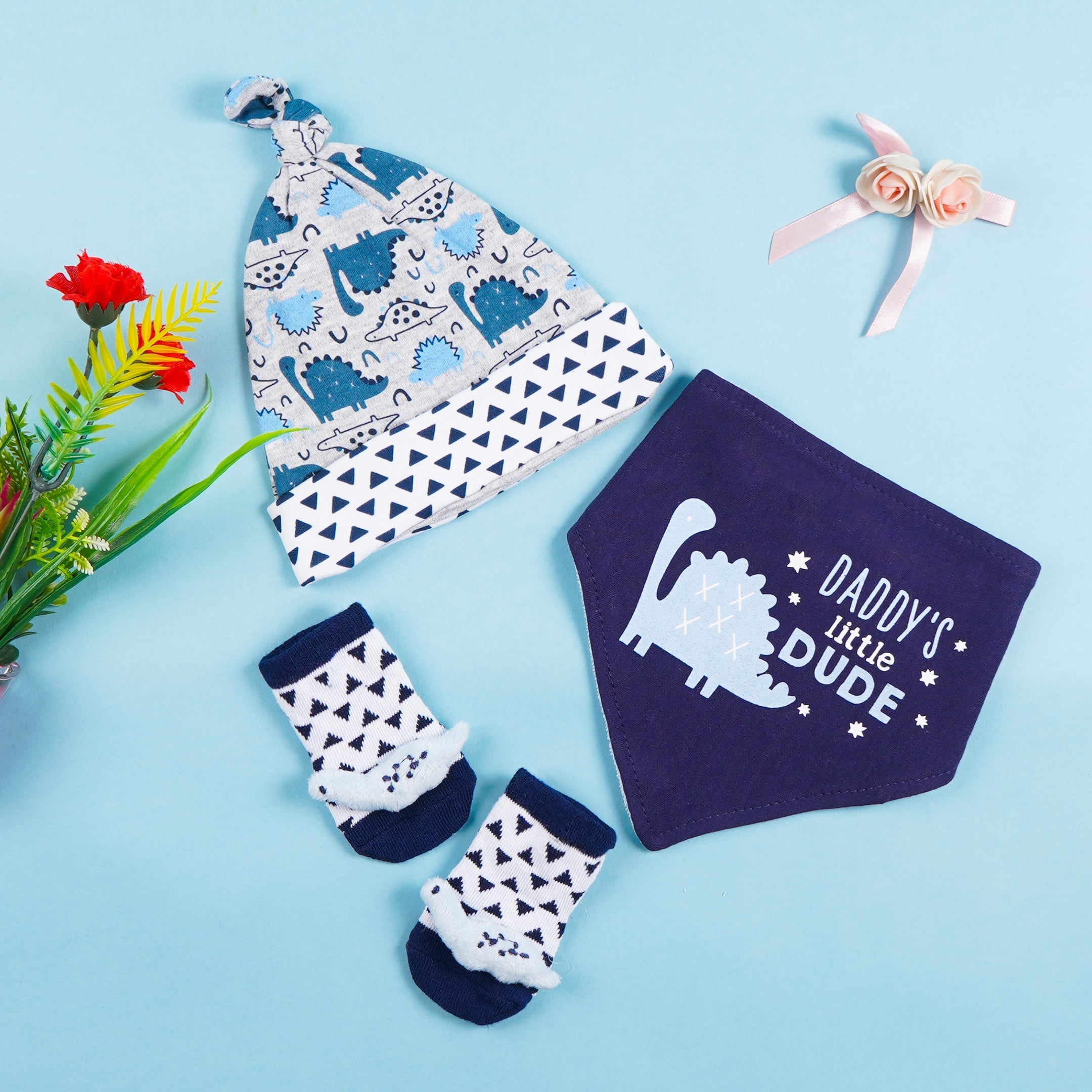 Baby 3Pcs Cap Bandana & Socks Set Dinosaurs Navy Blue - Sunshine