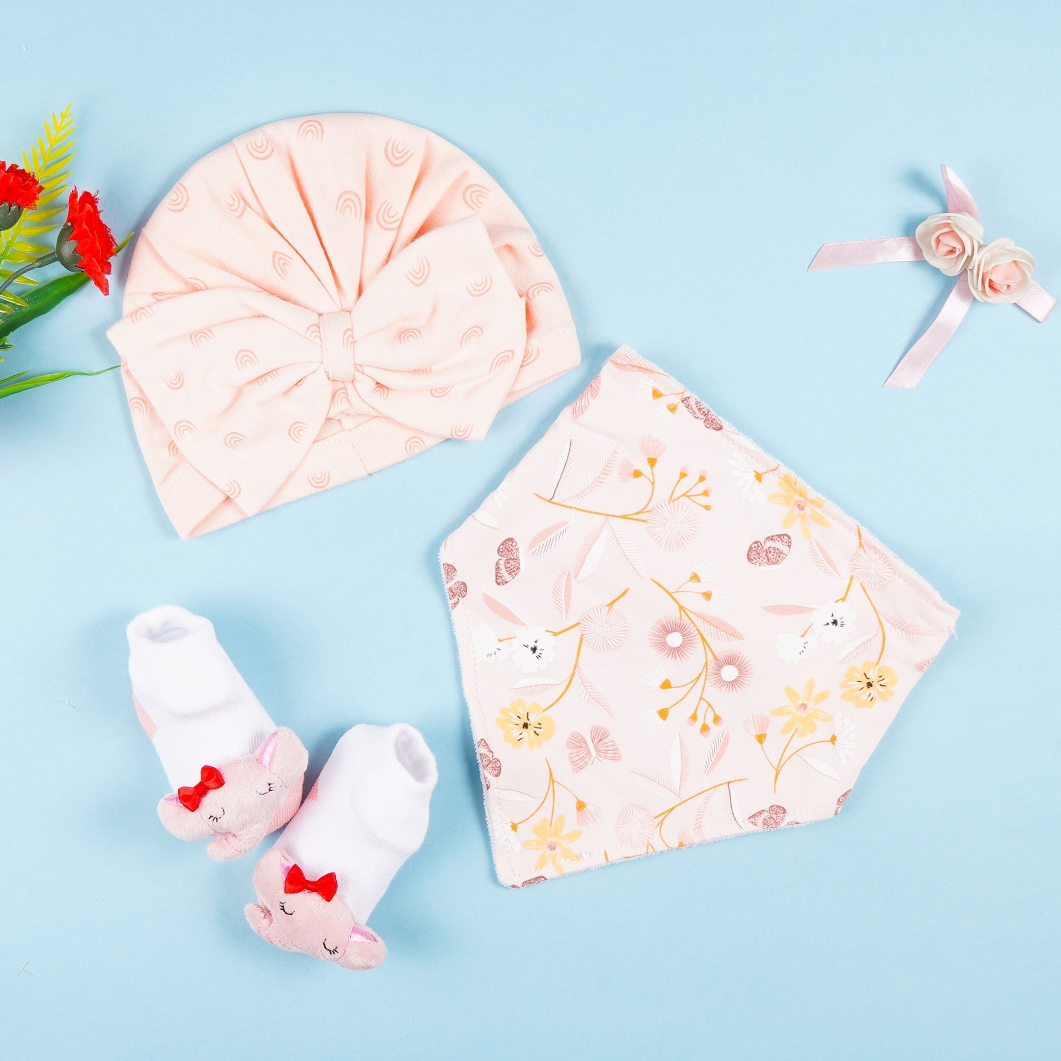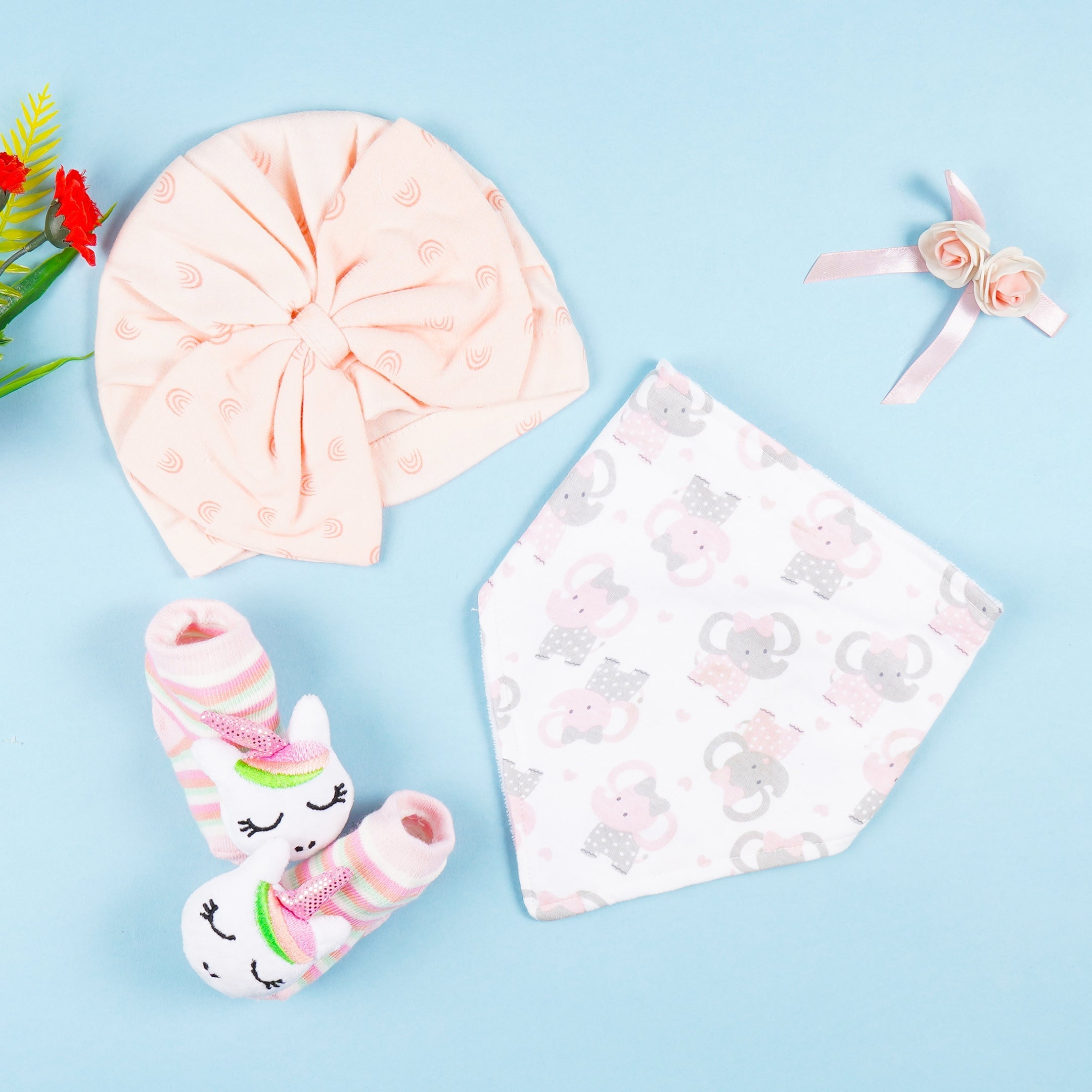 Baby 3Pcs Cap Bandana & Socks Set Elephant Peach - Sunshine