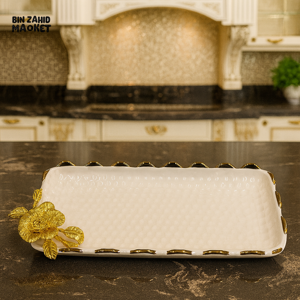 SERVING DISH WITH GOLD ROSE DETAIL – LUXURY KITCHEN TABLETOP PLATTER - 11 M11-W